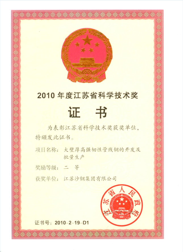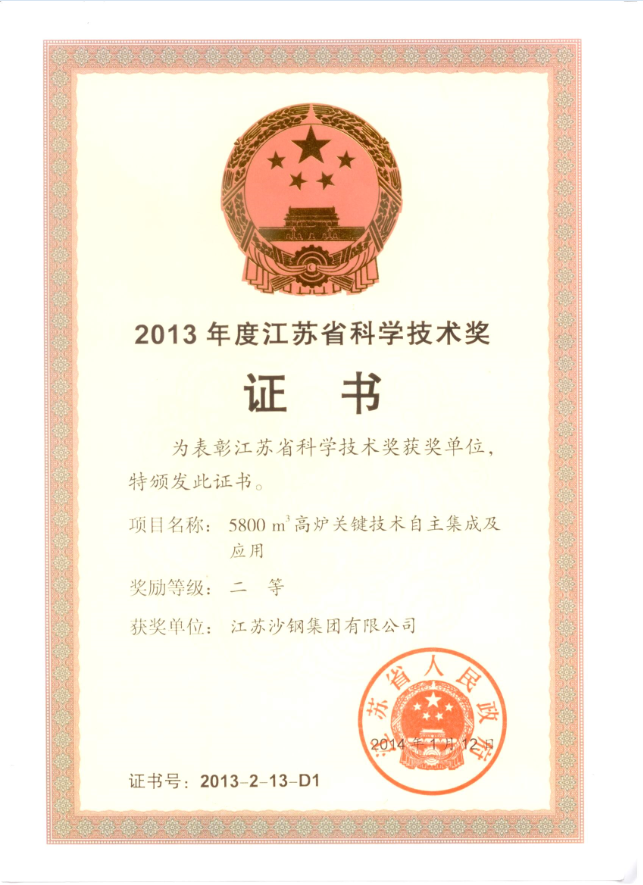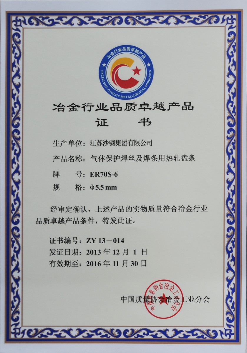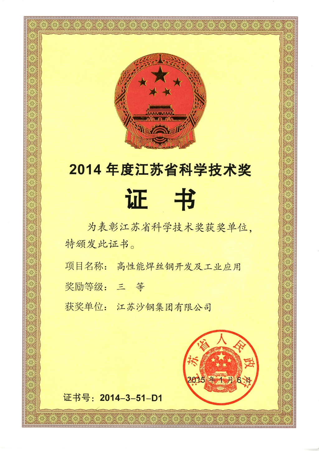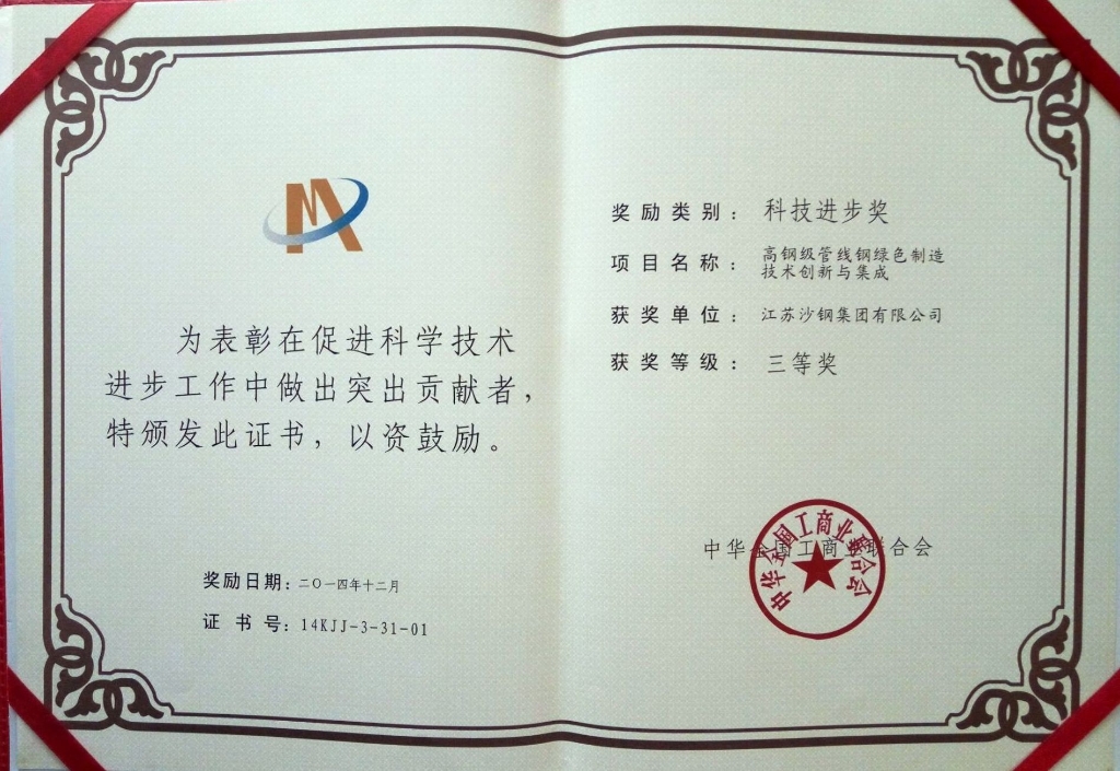 2014年度江蘇省科學技術獎三等獎——高性能焊絲鋼開發及工業應用
