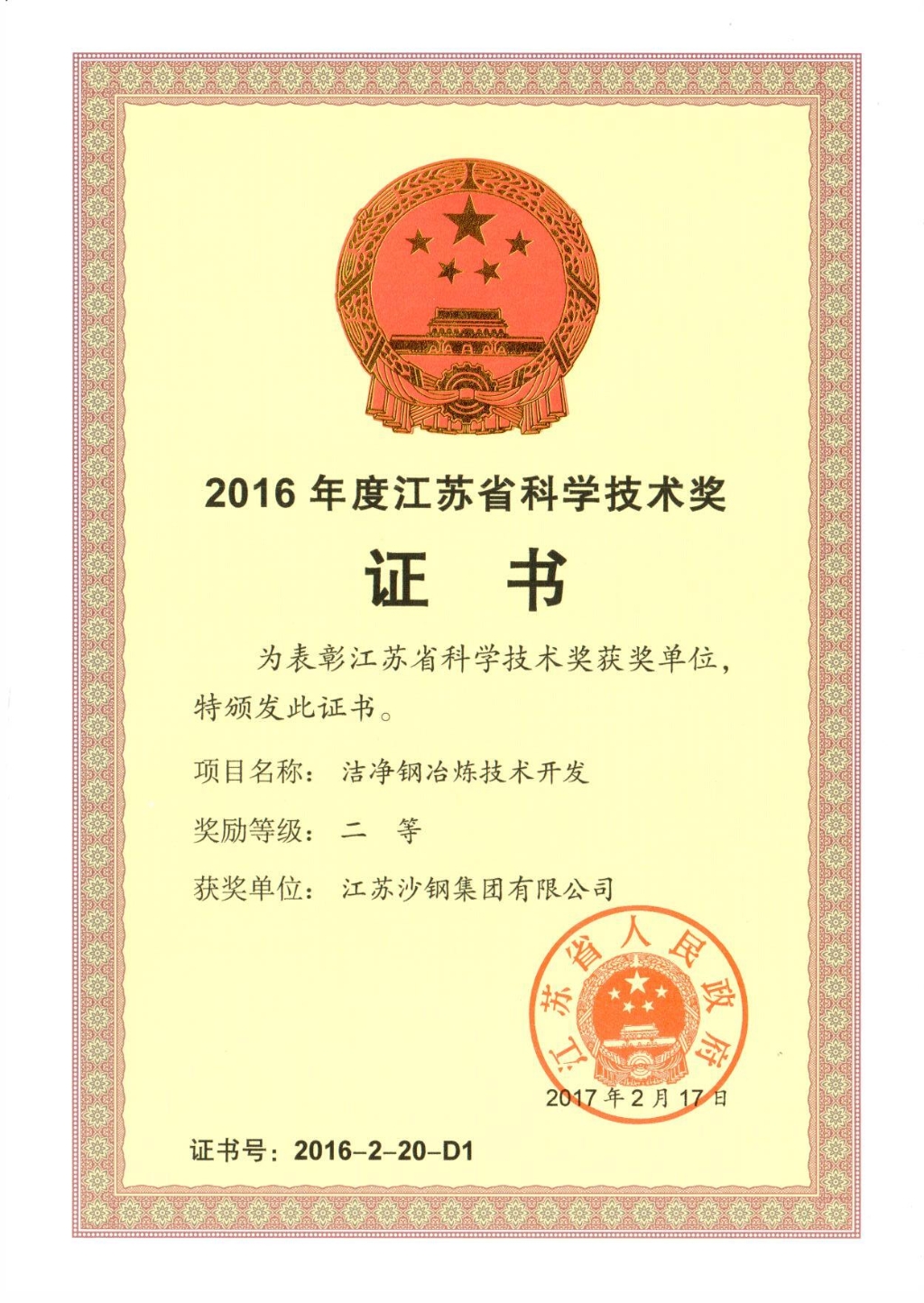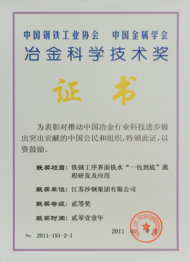 2016年度江蘇省科學技術獎二等獎——潔凈鋼冶煉技術開發