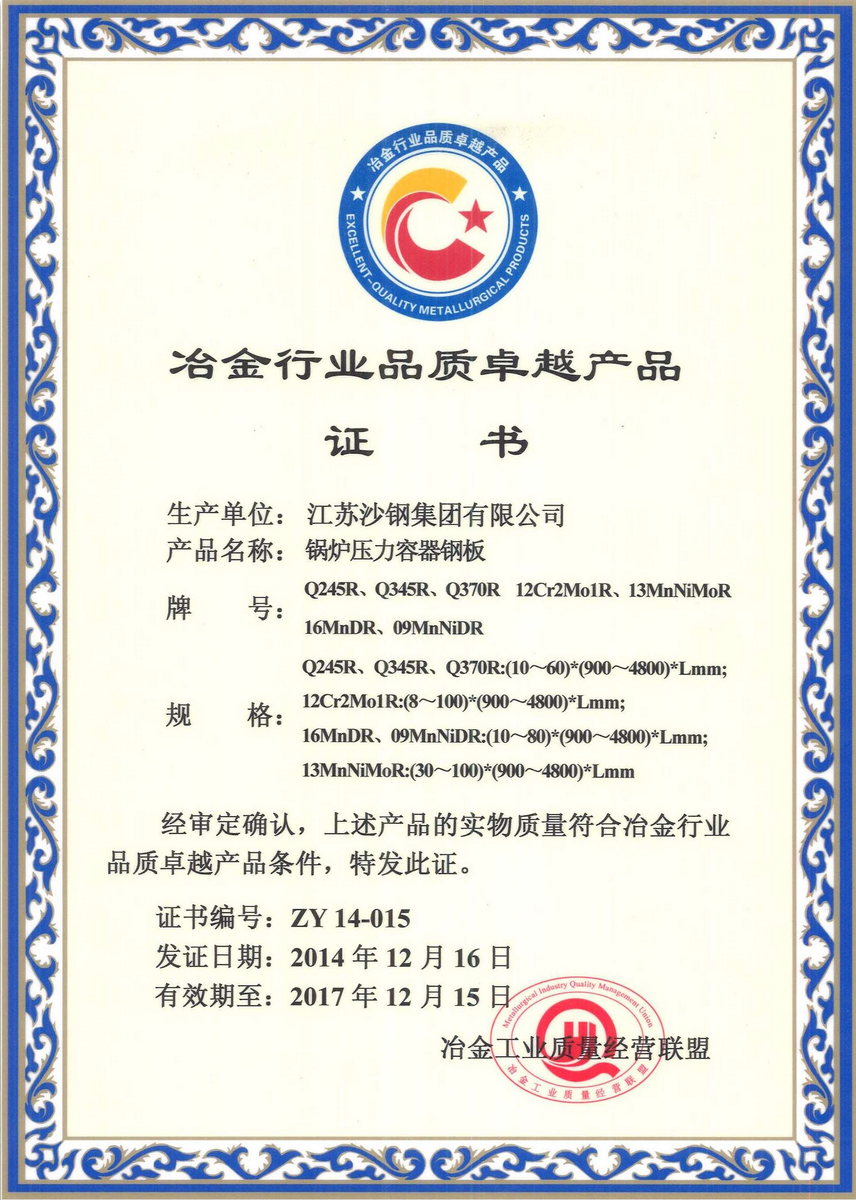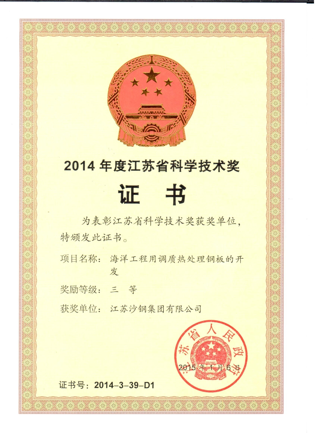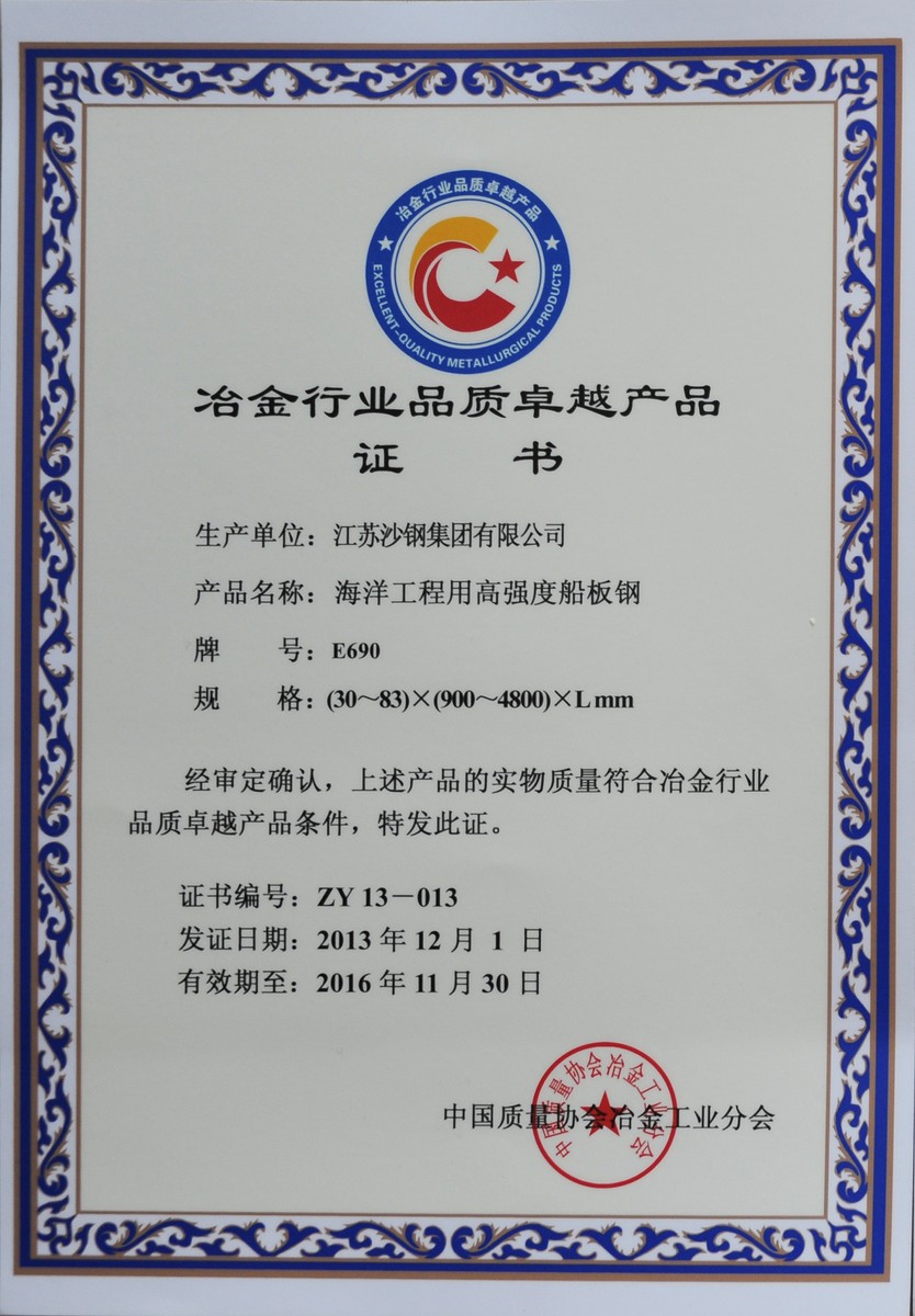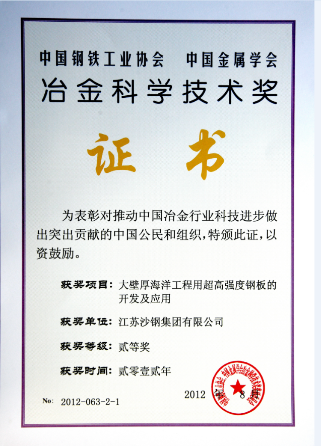 2014年度江蘇省科學技術獎三等獎——海洋工程用調質熱處理鋼板的開發
