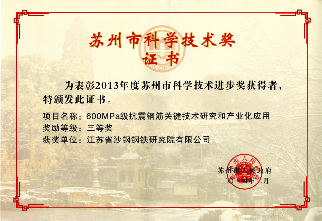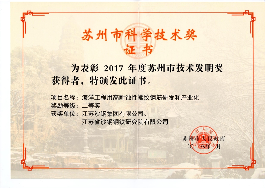 蘇州市技術發明獎——海洋工程用高耐蝕性螺紋鋼筋研發和產業化