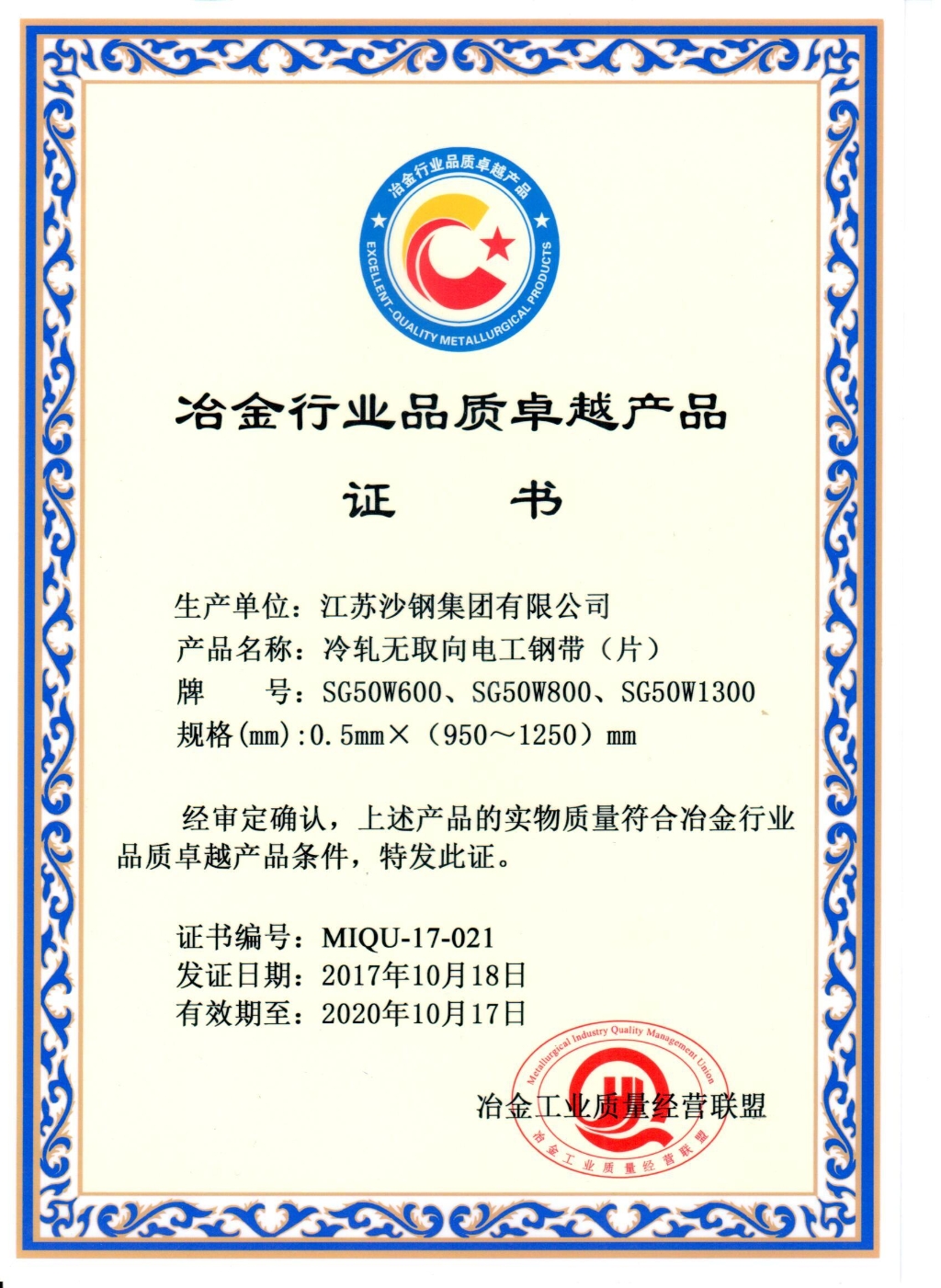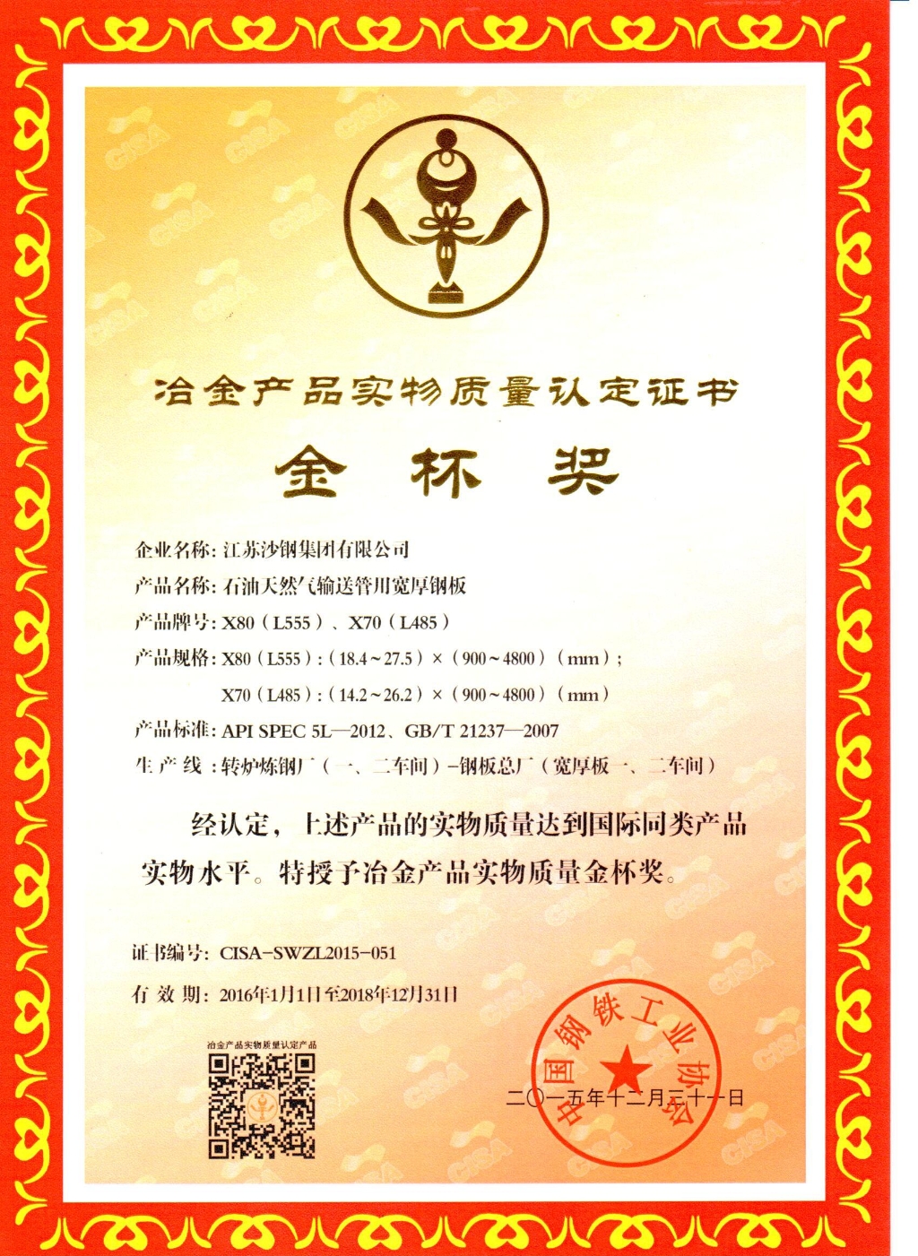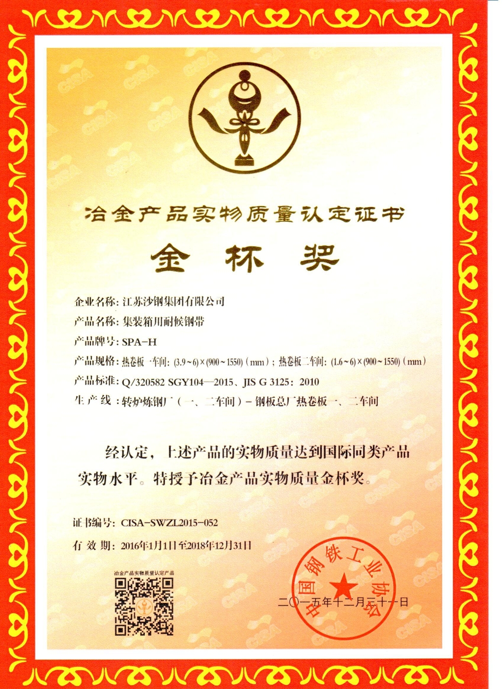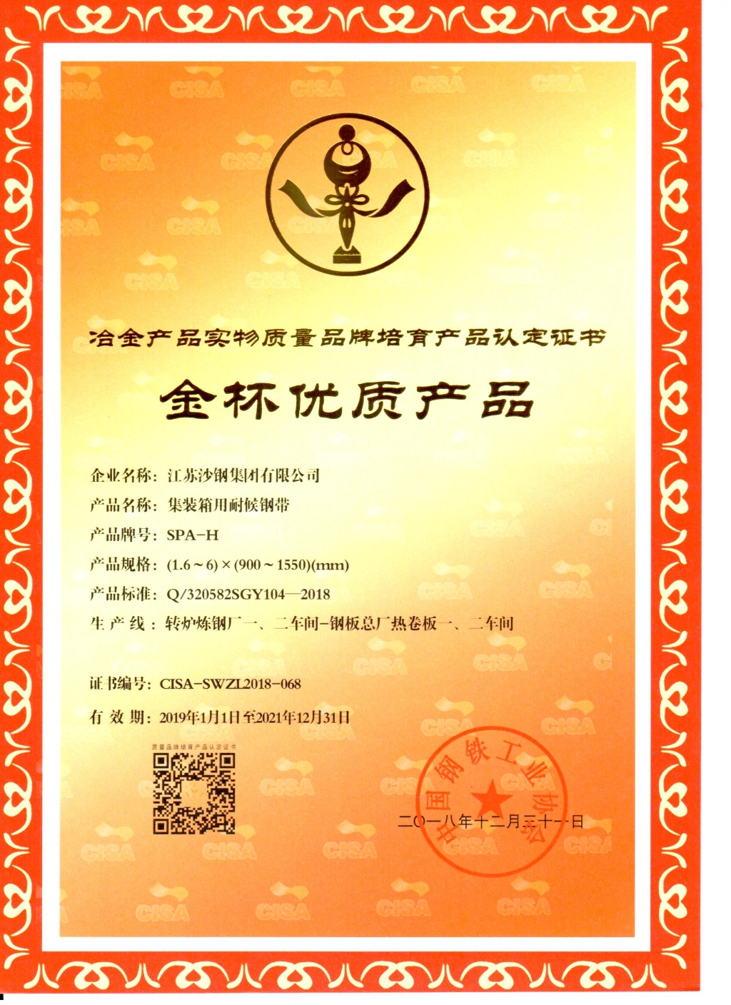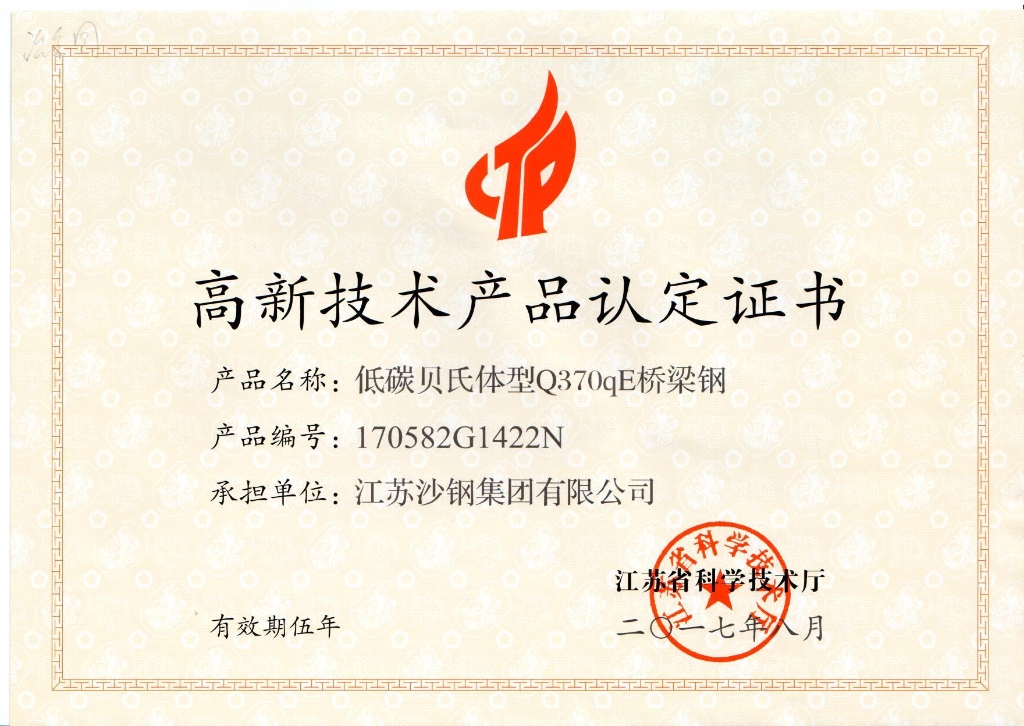 高新技術產品認定證書——低碳貝氏體型Q370qE橋梁鋼