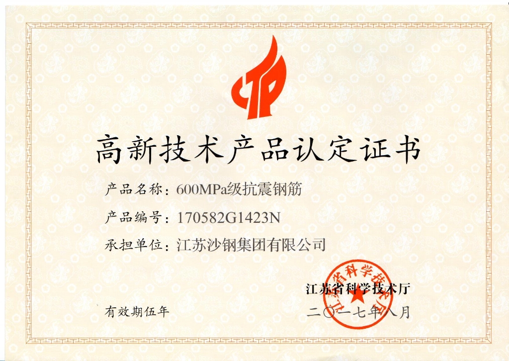 高新技術產品認定證書——600Mpa級抗震鋼筋