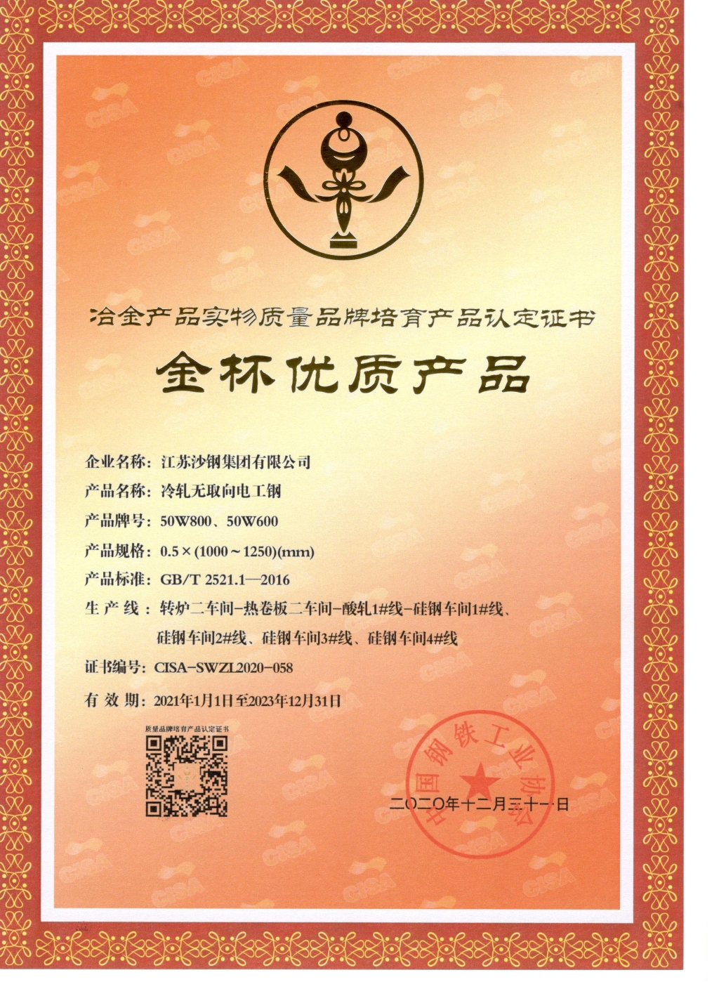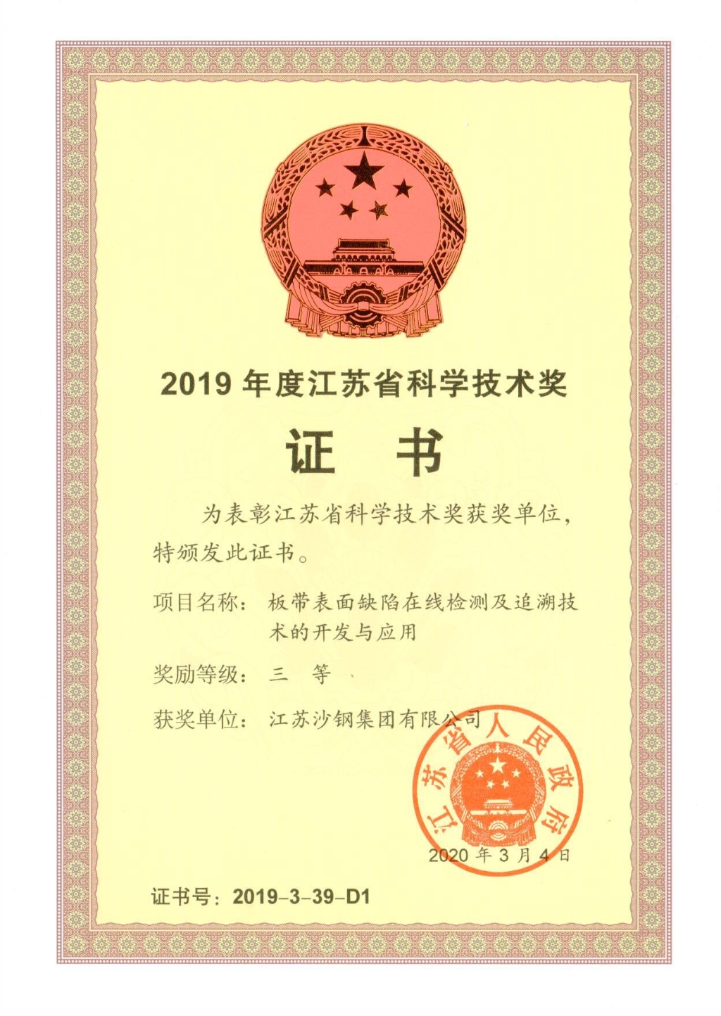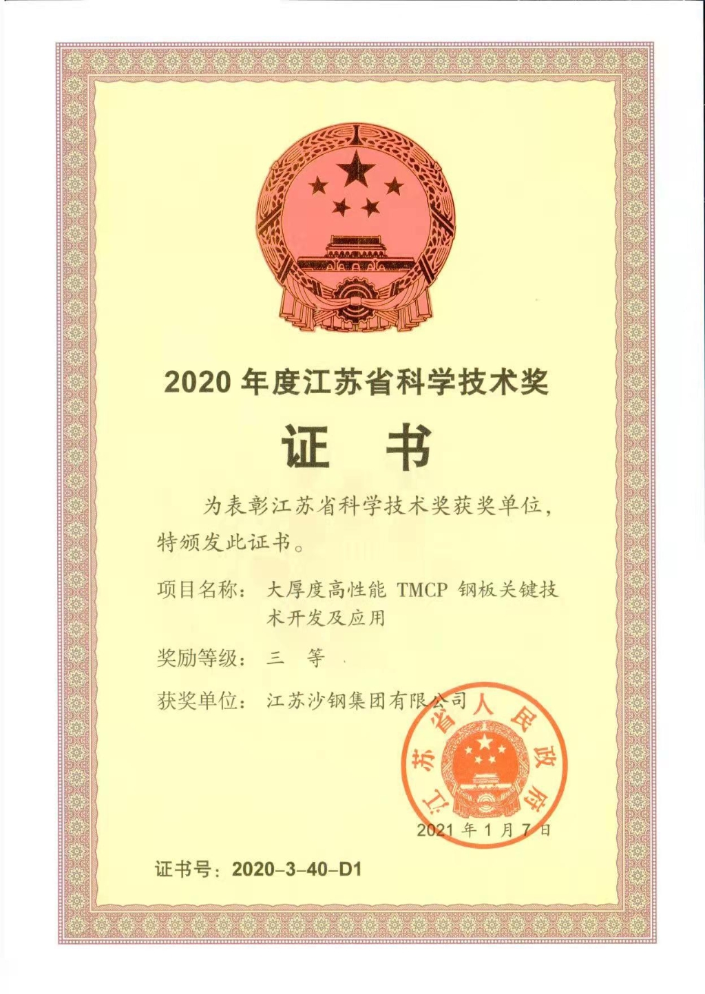 2020年度江蘇省科學技術獎證書——大厚度高性能TMCP鋼板關鍵技術開發及應用