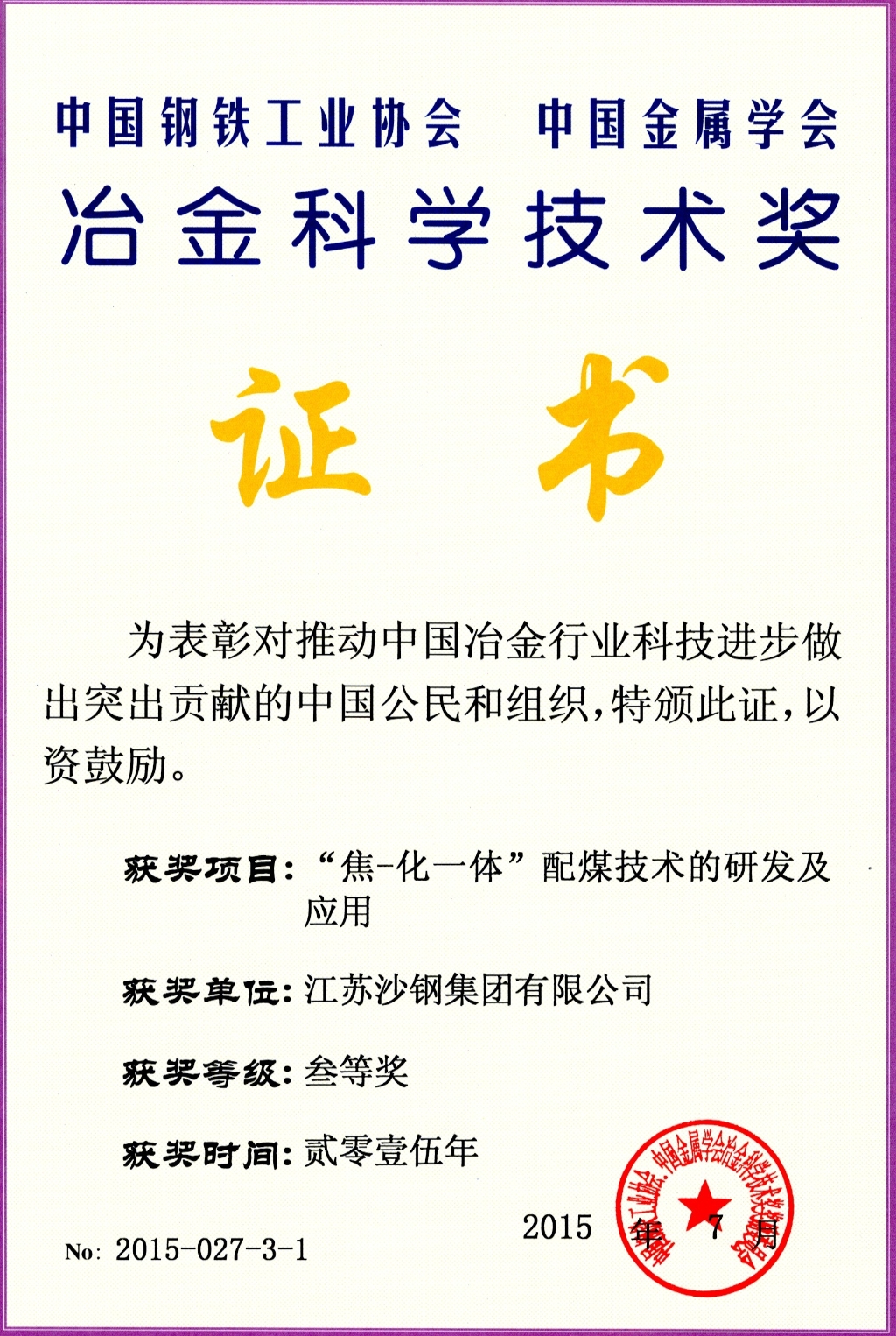 冶金科學技術獎三等獎——焦化一體配煤技術的研發及應用