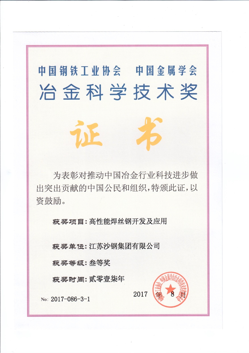 冶金科學技術獎三等獎——高性能焊絲鋼開發及應用