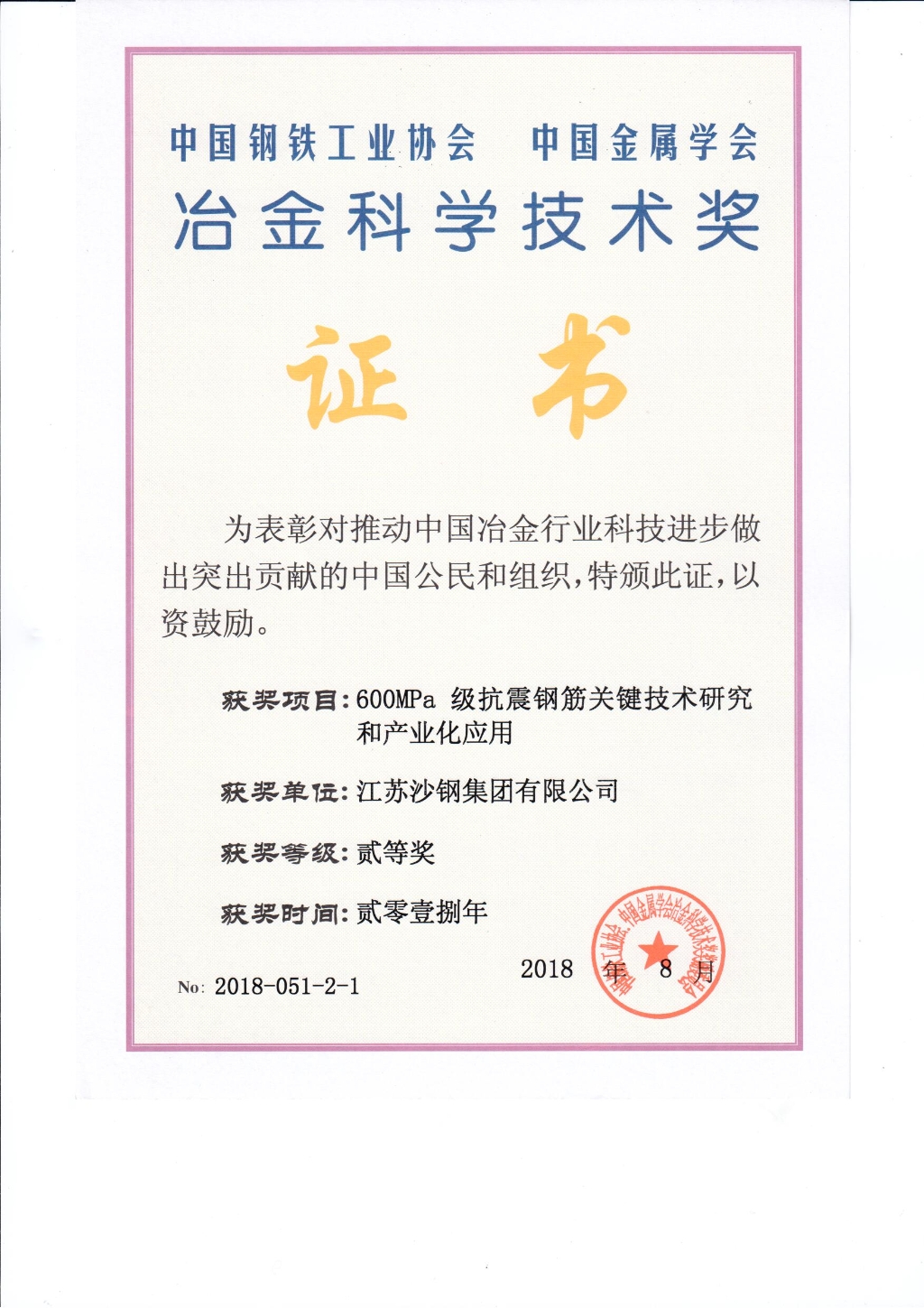 冶金科學技術獎二等獎——600MPa級抗震鋼筋關鍵技術研究和產業化應用